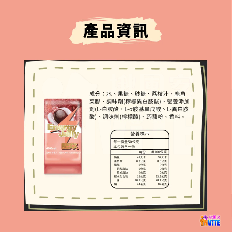 水、果糖、砂糖、荔枝汁、鹿角菜膠、調味劑(檸檬異白胺酸)、營養添加劑(L-白胺酸、L-α胺基異戊酸、L-異白胺酸)、調味劑(檸檬酸)、蒟蒻粉、香料。